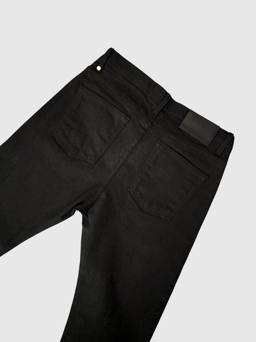 This garment is constructed from premium, raw unwashed black selvedge denim. The raw finish ensures that over time, the deep black fabric will develop a personalized, high-contrast grayscale patina, transforming the jeans into a truly unique, custom piece based on your wear.Â