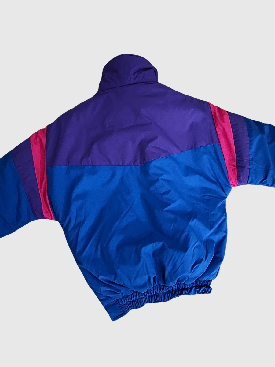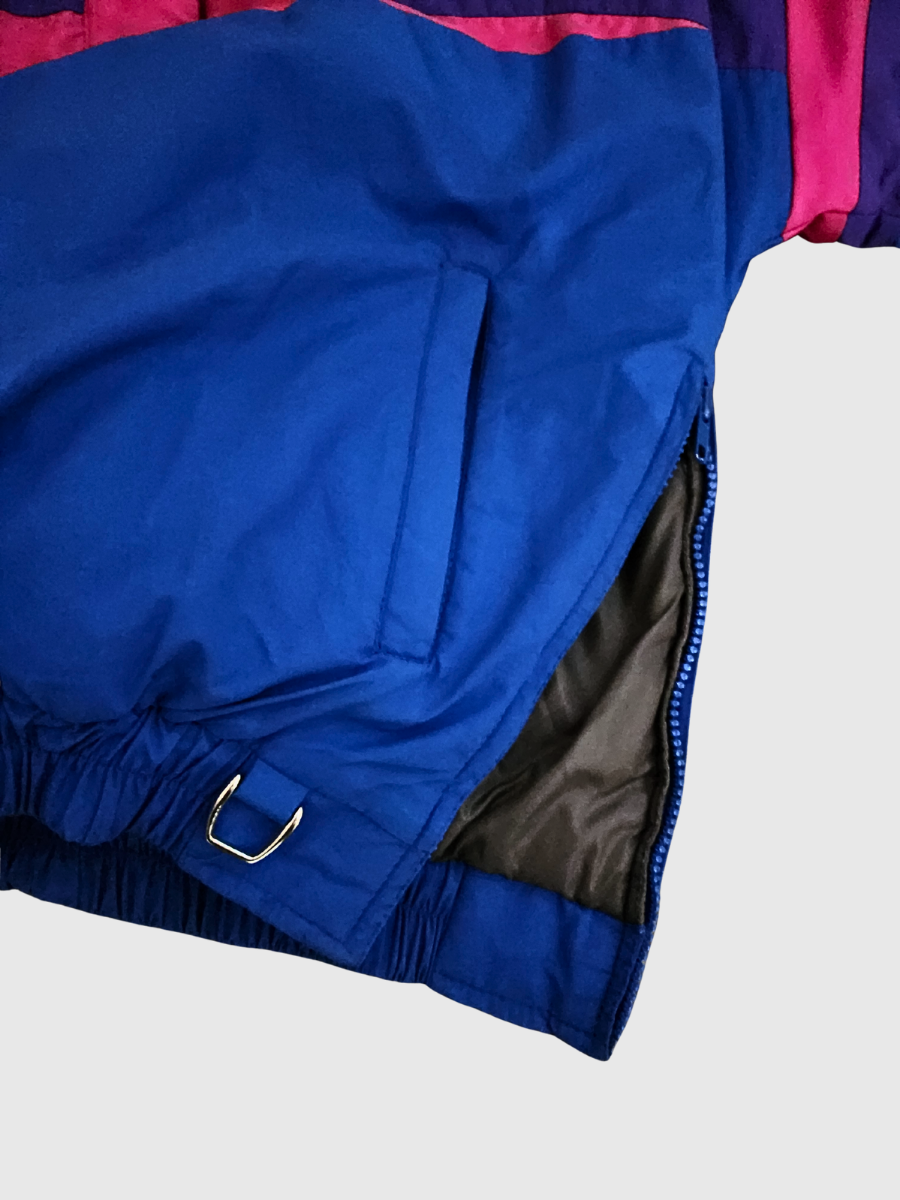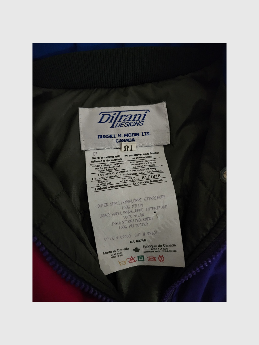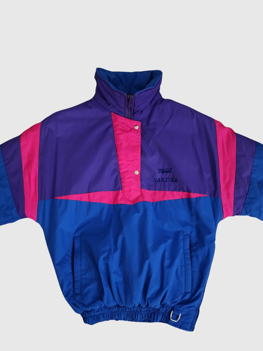 Vintage 90s Ditrani Nakiska Hi-Collar Ski Jacket. Unleash your inner 90s slopes star! This vibrant jacket features a killer neon color-block design in electric purple, hot pink, and bold blue. The iconic hi-collar and slouchy fit make this a standout piece of retro outerwear. Perfect for festivals or hitting the resort in vintage style.