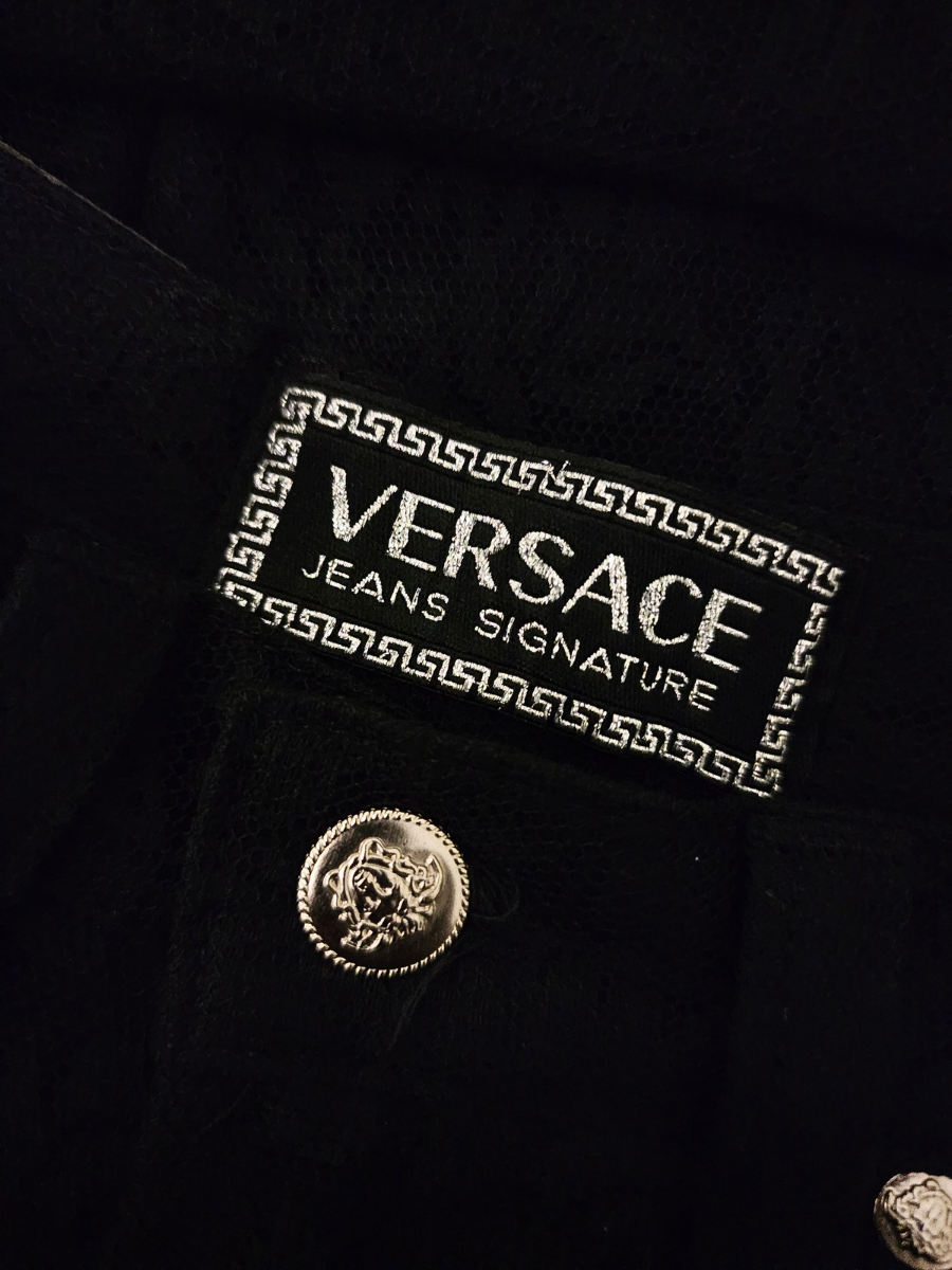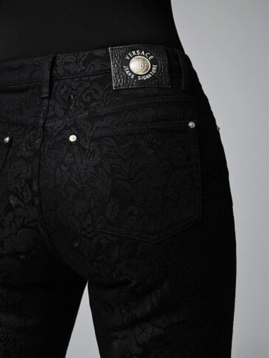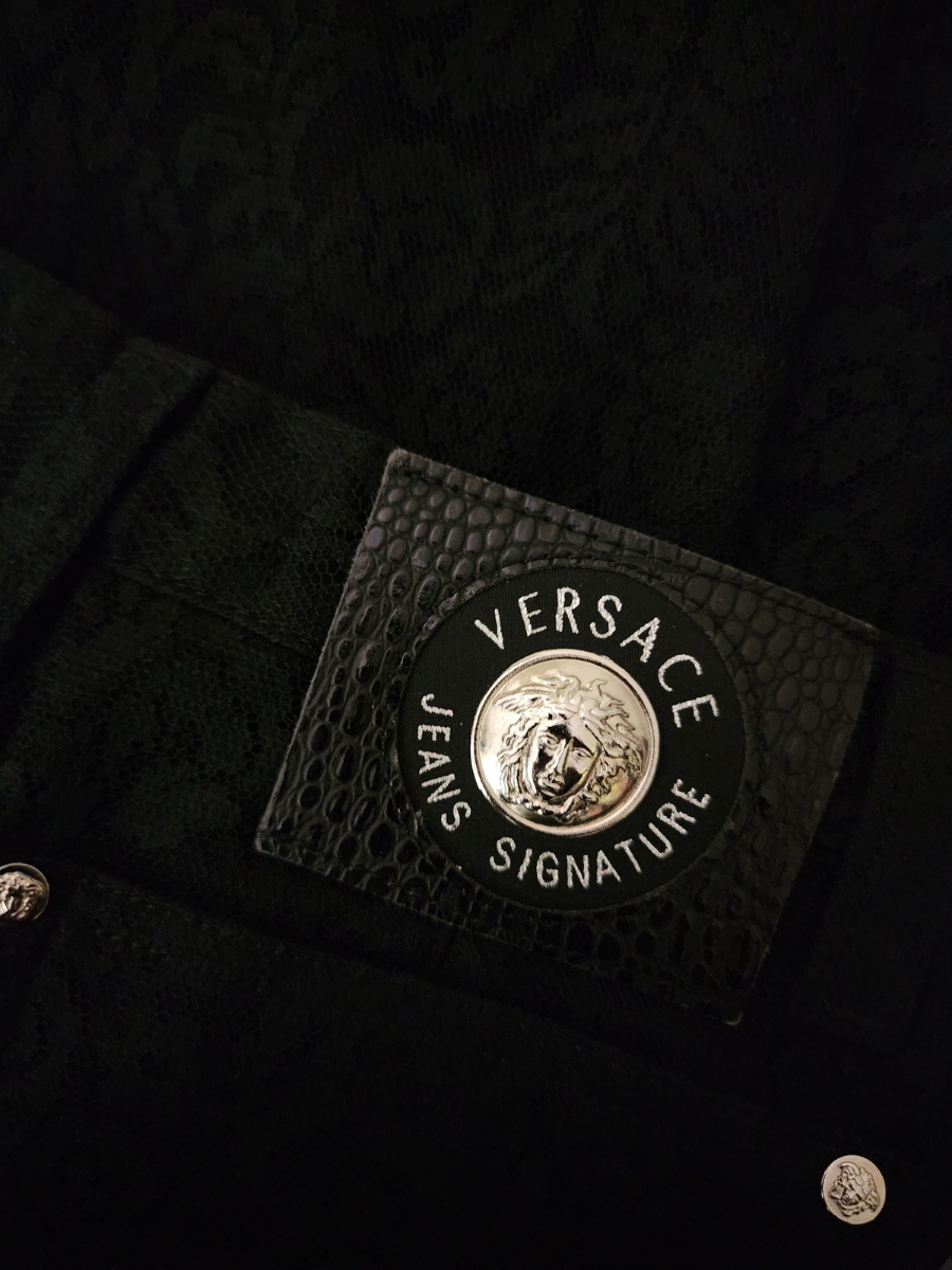 Vintage 90s Versace Jeans signature floral lace pants are a stylish and iconic piece of fashion from the era. These pants are made from delicate and intricate floral lace material, which is both beautiful and timeless. The lace material has a sheer quality, which creates a subtle and alluring look. Goes beyond fashion, trends and the desire to flaunt. Classic Versace Medusa Head with pebbled leather patch. Versace Medusa Head logo-engraved button closure and rivets on pockets.